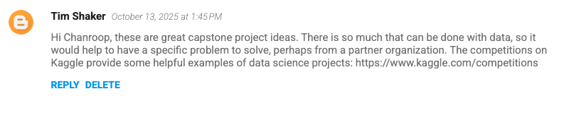 This week, we worked on helping our teammates develop their capstone project ideas. Here are some comments I left on my teammates’ blogs: