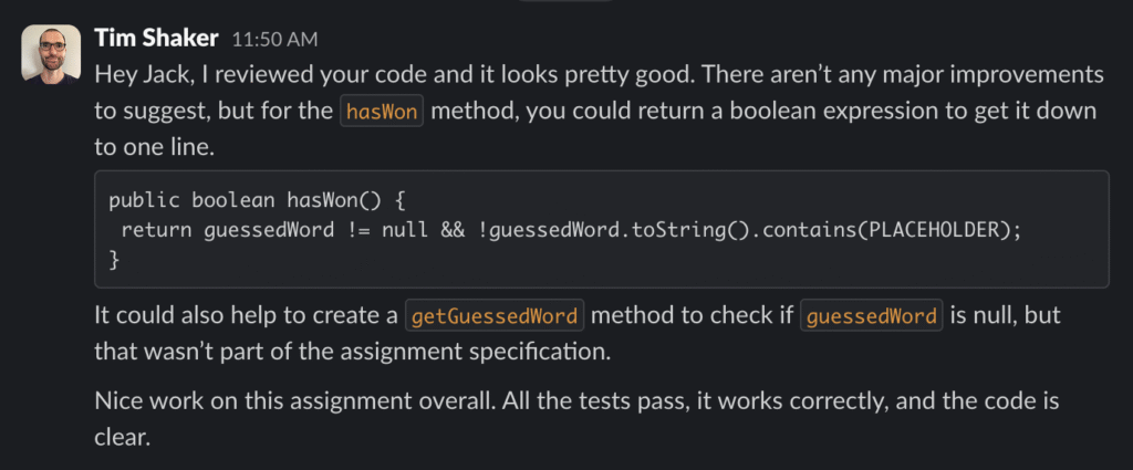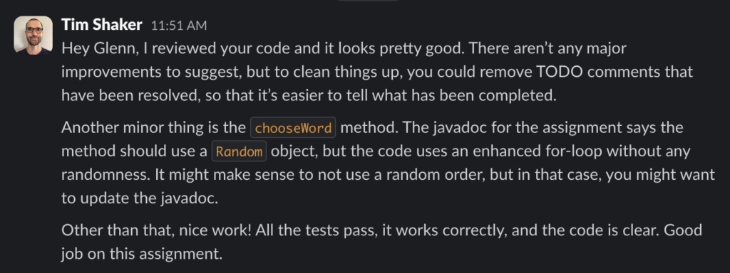 I reviewed code from Khanh, Glenn, and Jack for the Hangman assignment. There weren’t many major improvements to be made. The assignment was fairly straightforward, so we all followed the instructions and produced similar code. Here are the reviews I shared with my classmates: