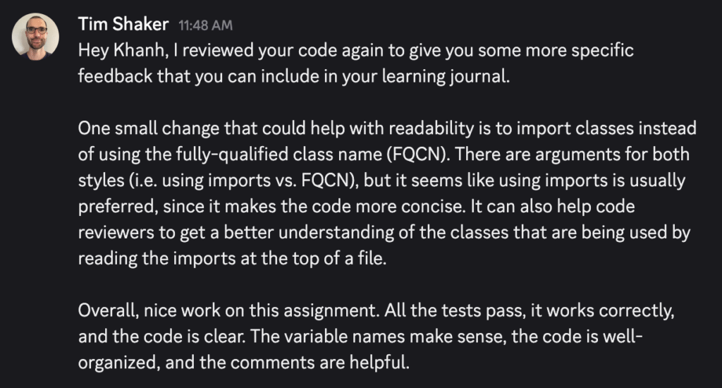 For example, one thing I’ll do is to make sure the code is syntactically correct before implementing any logic. Fixing the syntax errors will usually allow the code to compile, which is always a step in the right direction. From there, it’s a lot easier to focus on getting the tests to pass and following the assignment’s instructions on how to implement the code.